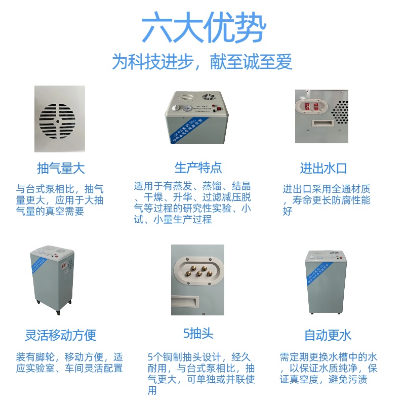 5抽頭可單獨使用或并聯使用,引氣流量大,五通管并聯、可滿足大型旋轉蒸發器或反應器的需求。